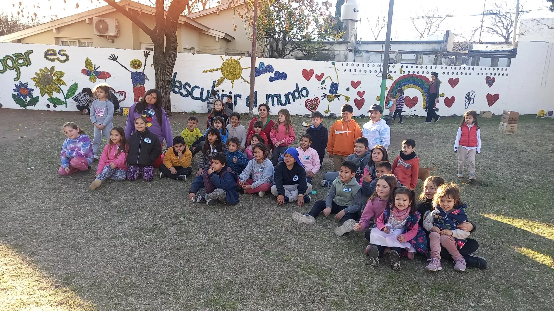La siguiente actividad fue la confección de un eco mural en el parque infantil “Constancio Vigil”, donde niños y adultos colaboraron para ilustrar un paredón con tapitas plásticas de colores. La docente de arte Noelia Agüero dirigió esta obra, y el mensaje “Jugar es descubrir el mundo” quedó plasmado junto a varias figuras.